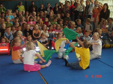 Am 10. August 2006 wurden 34 Kinder eingeschult. Wie auch in den letzten Jahren fand nach dem Einschulungsgottesdienst in der Veener Dorfkirche die Einschulungsfeier in unserer Turnhalle statt. Alle Kinder der Schule, Lehrer und Eltern waren dabei und begrüßten die Schulanfänger mit lautem Beifall. In diesem Jahr hatten die Kinder der Projektgruppe Theater und Musik unter Leitung von Frau Winzen eine „Zirkusvorstellung" für die Schulanfänger eingeübt. Die Schulanfänger gingen nach der Feier zur ersten Unterrichtsstunde in ihre Klassen. Klassenlehrerinnen der 1a und der 1b sind Frau Genneper und Frau Davids. |