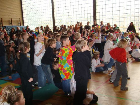 Am Schluss der Präsentation in der Turnhalle waren alle Kinder froh, dass sie ihre Masken, Kostüme und einstudierten Tänze hatten zeigen können. Die Lehrerinnen und Lehrer waren froh, dass alles so gut geklappt hatte. Die Eltern waren froh ihre Kinder auf der Bühne zu sehen. Das Publikum klatschte Beifall und die Indianer aus Klasse 4/1 a gaben ihren Indianertanz noch einmal als Zugabe. Dann starteten Kinder, Eltern und Lehrer in ein karnevalistisches Wochenende. |