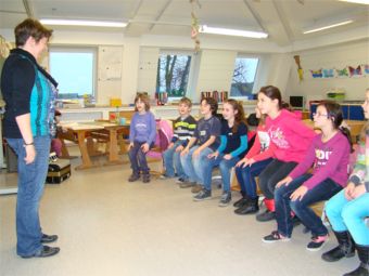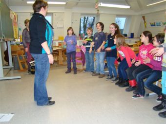 An dieser Station ging es um Spaß am Singen. Frau Roos und Frau van Bebber hatten sich lustige Lieder ausgesucht, die sie mit den Kindergruppen in kurzer Zeit lernen und singen konnten. Die Texte waren lustig, einprägsam und leicht zu lernen. Es wurden nicht nur die Stimmbänder, sondern auch der ganze Körper mit eingesetzt. Die Kinder genossen diese Station sehr.