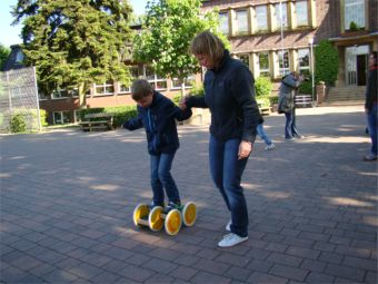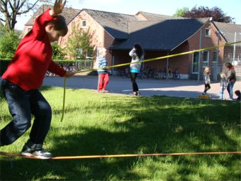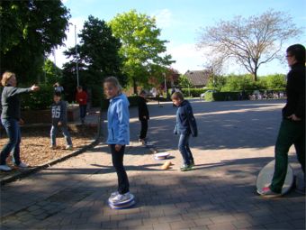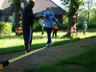 Slackline und Pedalo Die Kinder haben an dieser Station erfahren, was Gleichgewicht ist, wozu man es braucht und wo sich unser Gleichgewichtsorgan im Körper befindet. Durch verschiedene Angebote konnten sie ihr Gleichgewicht trainieren. Sie konnten auf einer Slackline (übersetzt: die Leine, die viel Durchhang hat oder lockere Leine) balancieren. Ihre Haltungs- und Bewegungskoordination sowie ihr Reaktionsvermögen auf verschiedenen Pedalos (Pedalo Classic, Pedalo-Sport und Pedalo- Surf) üben. |