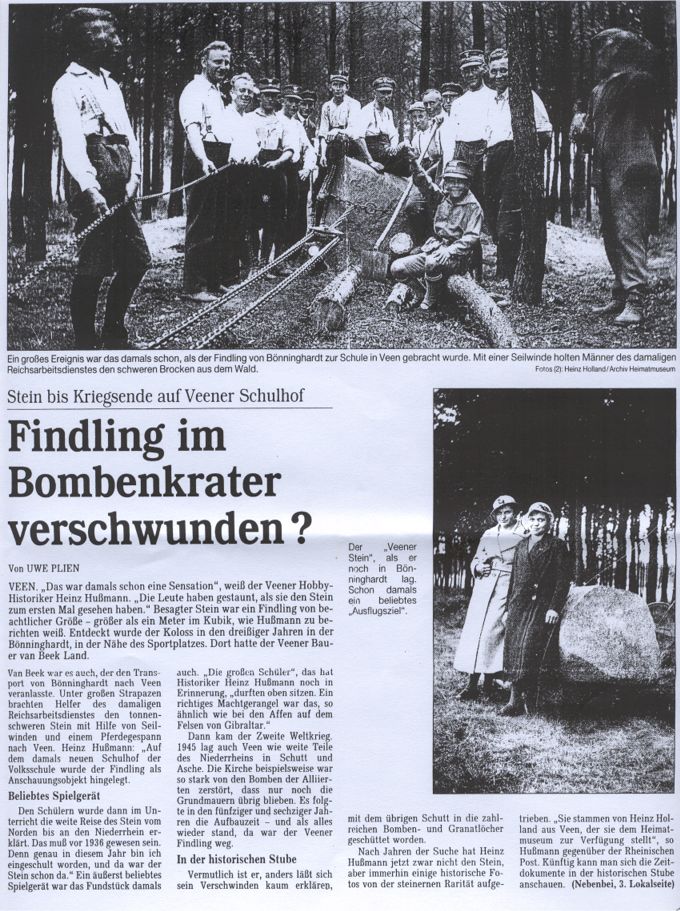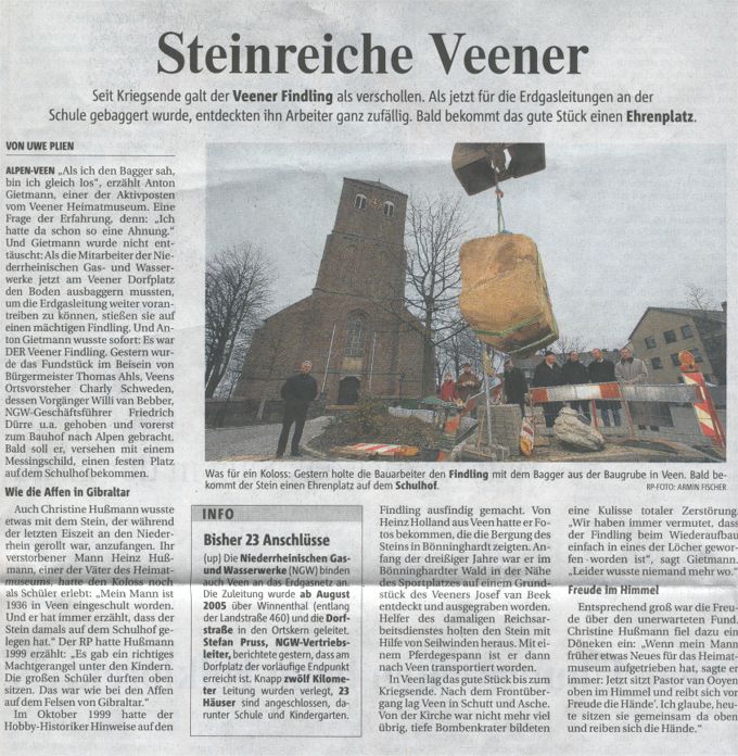 Überbleibsel aus der Eiszeit an der Veener Kirche gefunden. Der Stein stand schon einmal auf dem Schulhof. ALPEN. Man sieht sich immer zweimal. Mag der Spruch eigentlich auf Menschen gemünzt sein, in Veen trifft er auf einen Findling zu. Der war nämlich lange Zeit verschwunden, ehe er jetzt wieder ans Tageslicht gebracht wurde. Bei Anschlussarbeiten der Niederrheinischen Gas- und Wasserwerke (NGW) wurde er nun direkt vor der Haltestelle "Veen Kirche" entdeckt. "Ende August haben wir mit dem Verlegen der rund zwölf Kilometer langen Leitung begonnen. Es war das letzte Objekt, die Schule, die wir anschließen wollten, als der Bagger auf den Findling stieß", berichtete Stefan Prusst, Vetriebsleister der NGW. Sofort wurde Bürgermeister Thomas Ahls benachrichtigt. Und der informierte sofort Anton Gietmann, einer der Führer des Heimatmuseums Veen. Als der von dem Koloss hörte, war ihm gleich klar, dass ist der Findling, der mal auf dem Platz der Veener Schule stand. Anfang der 30er Jahre wurde das Überbleibsel aus der Eiszeit in der Bönninghardt gefunden. Bauer van Beek stieß auf seinem Acker in der Nähe des Sportplatzes auf den Stein. Er initiierte auch den Transport nach Veen. Mit Hilfe des Reichsarbeitsdienstes wurde damals mit einem Pferdegespann das über einen Kubikmeter große Teil zur Schule nach Veen transportiert. Als Junge darauf rumgeturnt Er sollte als Anschauungsobjekt für die Schüler dienen. Was die auch eifrig wahrnahmen, wie sich der ehemalige Ortsvorsteher Wilhem van Bebber erinnert: "Wir Jungen haben immer darauf rumgeturnt. Bis der Pastor kam und uns runterholte. Später konnte sich keiner mehr entsinnen, wo der Stein abgeblieben ist." Kein Wunder, denn Veen wurde im Zweiten Weltkrieg fast völlig zerstört, lag 1945 in Schutt und Asche. Von der Kirche, gleich neben der Schule gelegen, blieben nur noch die Grundmauern erhalten. Der Platz davor war übersät mit Bomben- und Granatenkratern. Diese wurde bei den Aufräumungsarbeiten Anfang der 50er Jahre verfüllt. Und bei dieser Gelegenheit muss wohl auch der Stein in der Erde vergraben worden sein. Nachdem der Stein gehoben war, wurde er erst einmal zum Bauhof gebracht. Hier soll er nun von allen Erdresten befreit und gesäubert werden. Anschließend wird er wohl wieder an seinem angestammten Platz auf dem Schulhof zu stehen kommen. Bürgermeister Thomas Ahls: "Der Findling wird mit einer entsprechenden Tafel versehen und kann dann wieder als Spielmöglichkeit dienen." Allerdings müsste vorher noch mit der Gemeindehaftpflichtversicherung geklärt werden, ob ein Prallschutz am Boden ausreiche.