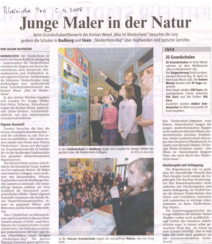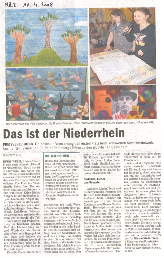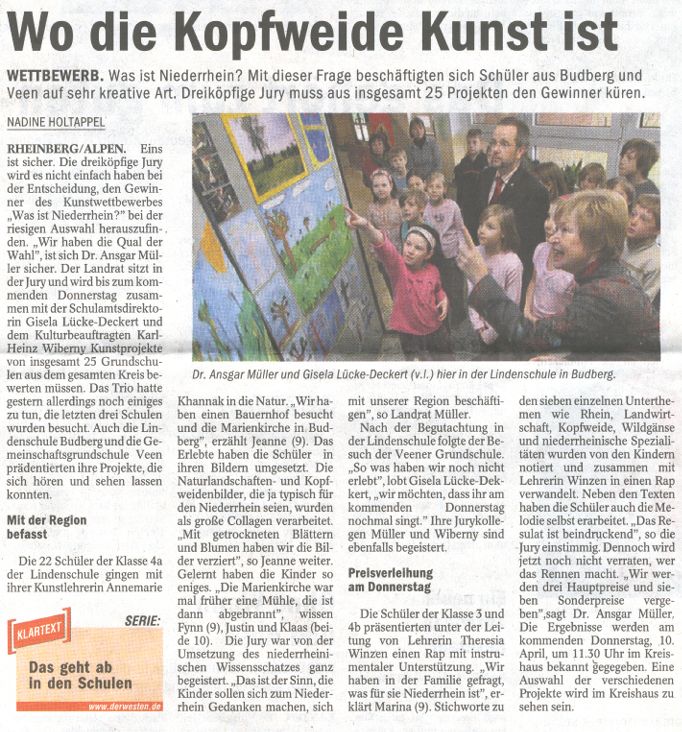 Unsere Grundschule nahm am Wettbewerb der Schulen im Kreis Wesel „Was ist Niederrhein?“ teil. Jubel!!! Wir haben den Wettbewerb mit dem 1. Hauptpreis gewonnen! 200 Euro für die Klassenkasse der 3/ 4 b und Lob und Anerkennung für alle Kinder und Frau Winzen! |