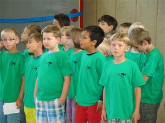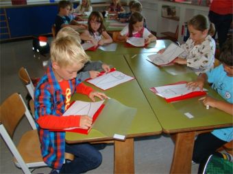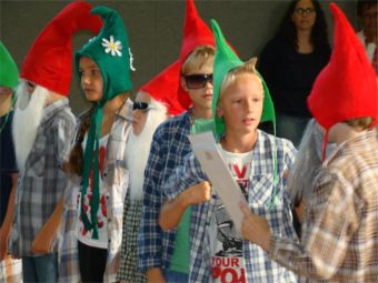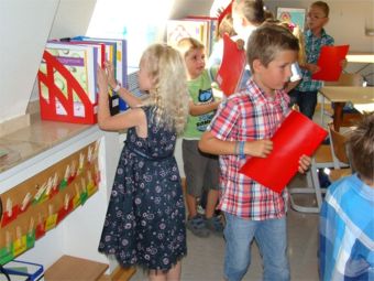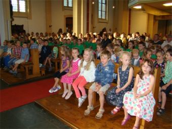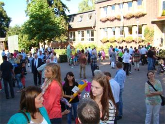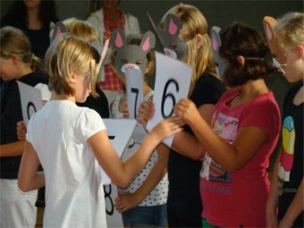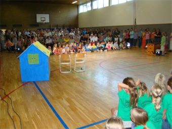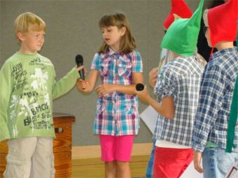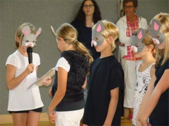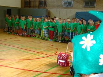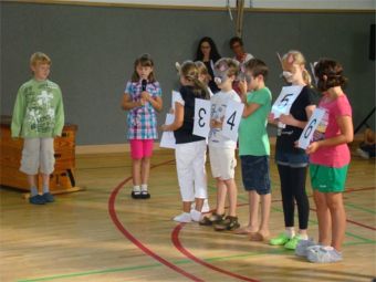 Am 5.September 2013 wurden 26 Schulanfänger eingeschult. Sie werden in einer Klasse von Frau Winzen unterrichtet. Die Lehramtsanwärterin Ina Petruschke unterstützt Frau Winzen bei ihrer vernatwortungsvollen Aufgabe. Zunächst gab es einen sehr bewegten Einschulungsgottesdienst in der Veener Kirche, der von Frau Hemping-Bovenkerk und Frau Pastorin Becks gehalten wurde. Thomas Janßen und Markus Lamers hatten die musikalische Begleitung. Nach dem Einschulungsgottesdienst wurden die Kinder in der Turnhalle der Schule von allen Kindern und Lehrern willkommen geheißen. Die Klasse 4 hatte für die Erstklässler ein Stück eingeübt. Die Häschen hatten in einer Schule die Zahlen und die Zwerge die Buchstaben geklaut, so dass die Kinder dort gar nicht lernen konnten. Die Häschen und die Zwerge hatten auch ziemliche Schwierigkeiten mit den Zahlen und Buchstaben und brauchten schließlich die Hilfe der Kinder. Am Schluss konnten die Häschen die Zahlen richtig, die Zwerge kannten die Buchstaben und die Kinder in der Schule konnten schließlich mit dem Lernen fortfahren. Die Kinder der Klassen 2 und 3 hatten dazu passende Lieder geübt und traten in ihren neuen Schul-T-shirts auf. |