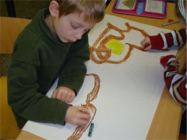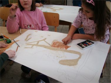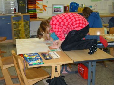 Von den vielen Bewohnern des Bodens wurden im Projektunterricht der Klasse 2/3 a der Maulwurf und der Feldhamster näher betrachtet. Die Kinder sahen Filme über die Tiere, trugen ihr Wissen zusammen, recherchierten im Internet und zeichneten schließlich in Partnerarbeit unterirdische Baue des Maulwurfs. In den Projektheften schrieben die Kinder Maulwurfgeschichten, die Steckbriefe der Bodentiere, zeichneten und malten. |
