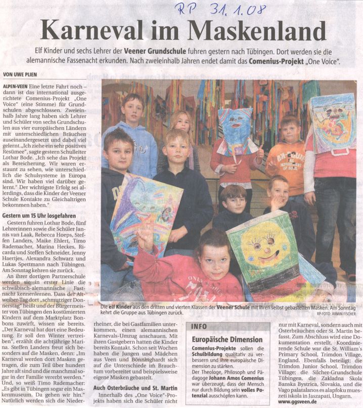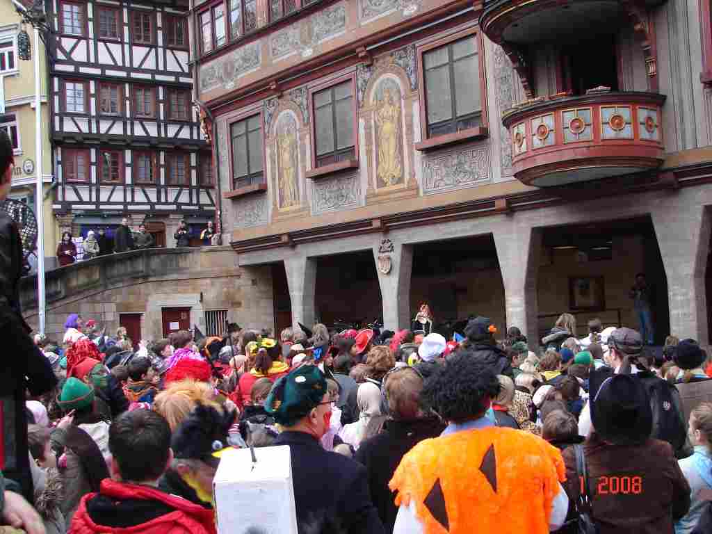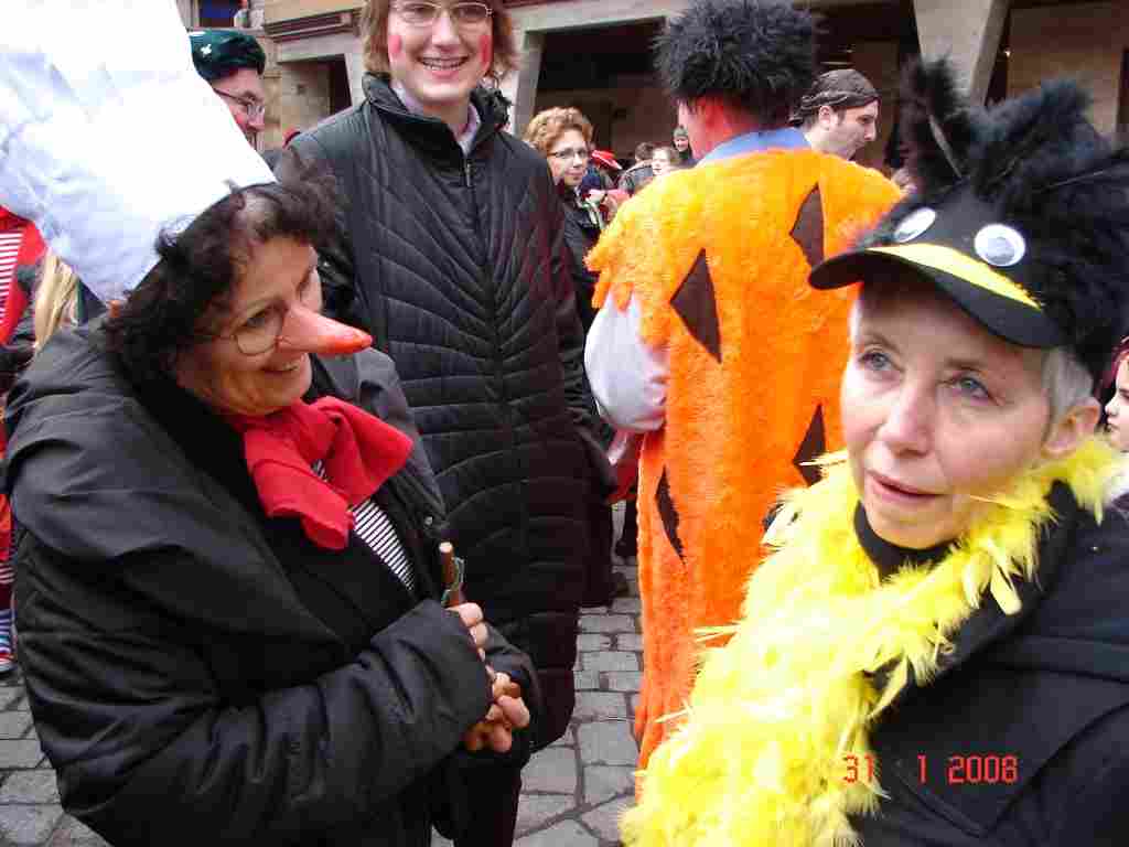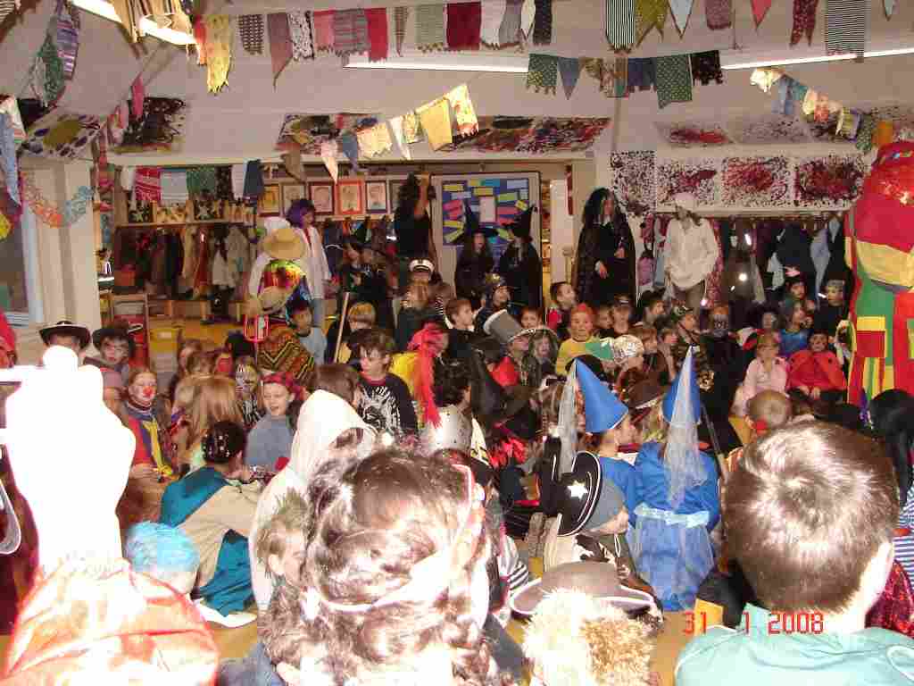 Zur Fasenacht (am 31.1.08 – Donnerstag) - von Ricarda Wir sind verkleidet in die Schule gekommen und es gab viele Vorführungen. Nach der Pause sind alle Kinder losgegangen. Als wir am Rathaus ankamen, sangen wir, damit Boris Palmer (Bürgermeister) uns Gummibären gab. „ Herr Palmer! Komm und gib uns viel Gummibären - sollen wir verhungern hier - Herr Pali, Herr Pali, Herr Pali“ Als alles verteilt war, machten wir noch einen kleinen Umweg durch die Stadt Tübingen. Obwohl es viel weniger Süßes gab, als hier, fand ich es sehr schön. |
