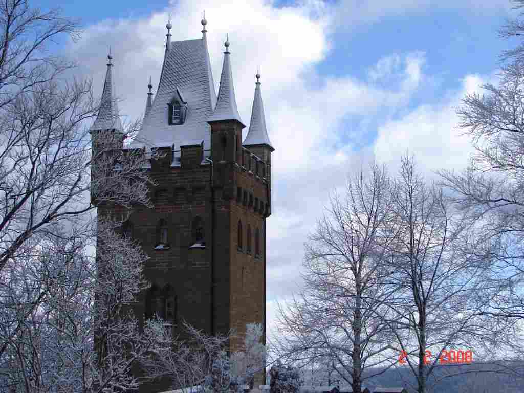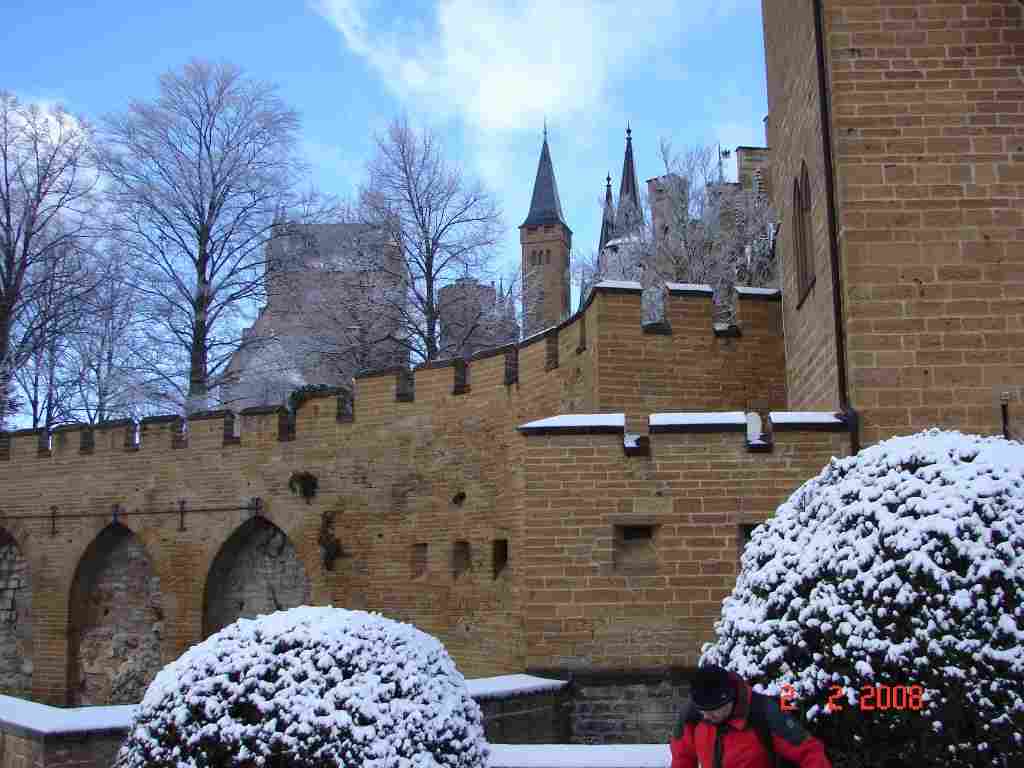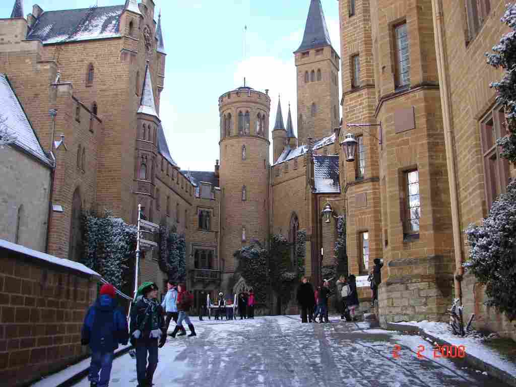 Ausflug zur Burg Hohenzollern - von RebeccaWir sind mit dem Bus dort hin gefahren. Es sind welche aus England, der Slowakei, Ungarn und Deutschland mitgefahren. Wir sind hoch auf den Berg gelaufen. An den Burgmauern hingen Eiszapfen und es lag dicker Schnee. Auf der Burg wohnten die Nachfahren des deutschen Kaisers. Friedrich der Große zog in den Krieg. Dort wurde eine Gewehrkugel auf ihn abgefeuert, diese traf aber nicht Friedrich, sondern seine kleine Schnupftabakdose in der linken Westen-Tasche. Somit rettete die Dose sein Leben. Diese Dose steht in der Schatzkammer der Burg. Dort steht auch eine Krone aus purem Gold. |