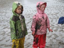 schnell zum Haus zurück gingen, um die nassen Sachen auf die