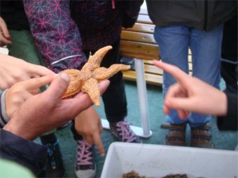 eine kleine Scholle, einen Seestern und eine Strandkrabbe, die er
