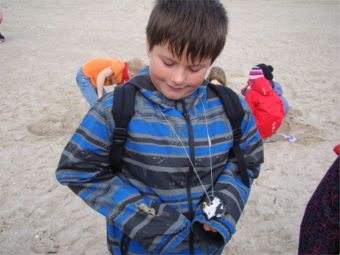Strand hat Leon eine Krabbe und einen Hühnergott gefunden.