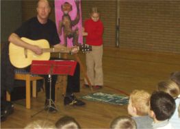 Am 17. November 2004 war der Autor des Kinderbuches „Appetit auf Blutorangen“ zu Gast in der GGS Veen und der GGS Wilhelm-Koppers, Menzelen. In einer Doppelstunde und mit wenigen Requisiten stellt er sein Buch vor. |