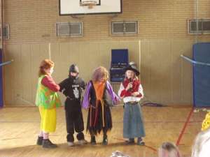 In der Turnhalle von Veen war der Teufel los. Die ganze Schule war anwesend. Alle Kinder hatten sich fantasievoll verkleidet. So sah man zum Beispiel Harry Potter, Virus, Mücke und viele Cowboys. Es waren auch einige Aufführungen zu sehen. Am besten war der Auftritt der Cats. Anschließend folgte eine Polonaise durch die Halle. Es gab dabei keinen Tumult. Weil die Sonne schien, bildeten150 Kinder und die Lehrer eine Riesenschlange und zogen durch das Dorf. Die Kinderpolonaise grüßte jeden Fußgänger mit einem kräftigen „Helau.!!!“ So ging der Karneval in Veen zu Ende und alle freuen sich schon auf das nächste Jahr. Veener Morgenpost, 5.3.2003, Gerrit Schmitz, Klasse 4a