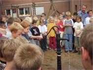 Herr Rademacher erklärte sich bereit, sich um die Sache zu kümmern. Schnell wurde ein Plan gemacht, Sachen besorgt und am 21.Juni wurde unter Mithilfe von Herrn Altmann, Herrn Kempchen und Herrn Bode der Plan in die Tat umgesetzt. 4 Meter wurde die Rammspitze in den Boden gerammt, die Pumpe montiert und ein Ablauf zur Ley gepflastert. Herr Rademacher hatte alles im Griff und die Aktion mit seiner Sachkenntnis so vorbereitet, dass die Aktion nach 4 Stunden erfolgreich beendet war. Am Montag, 23. Juni 03 wurde die Pumpe mit allen Schülerinnen und Schülern und den Lehrerinnen und Lehrern eingeweiht. Der neu ernannte Pumpenmeister Lukas Fürtjes, Klasse 2a, löste die Kette und förderte das erste Wasser. Er muss jetzt morgens die Pumpe aufschließen und mittags abschließen. Alle Kinder der Schule haben bei dem schönen Sommerwetter großen Spaß beim Matschen mit Sand und Wasser. Natürlich ist das Wasser kein Trinkwasser! Herzlichen Dank an die aktiven Eltern! |