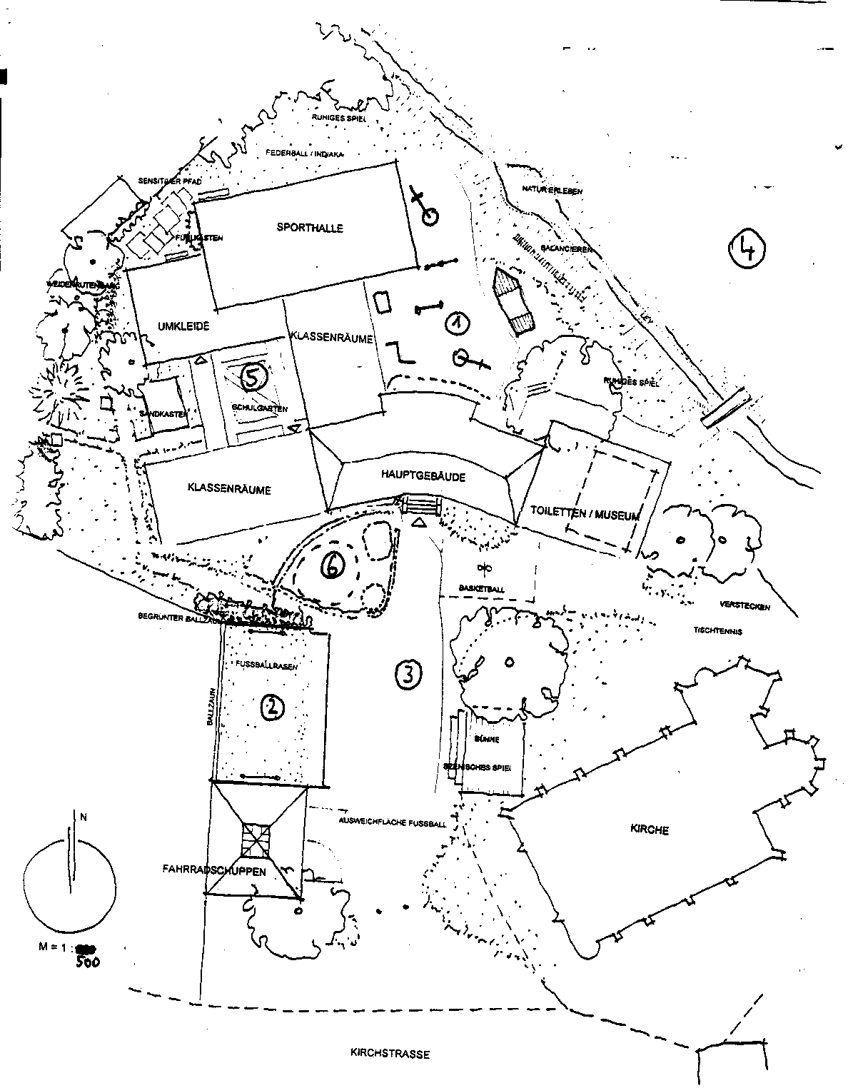 zum Kindergarten, Fahrradschuppen und zum Schulgebäude, fester