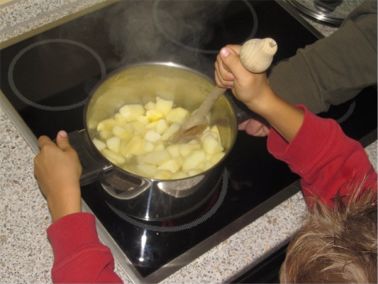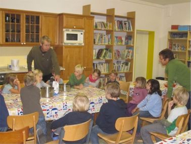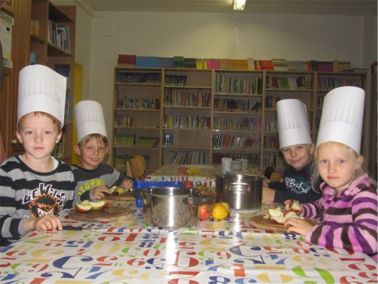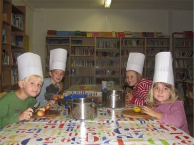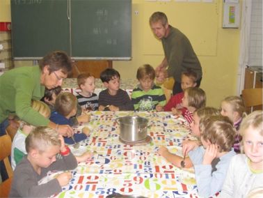Im Rahmen des Projektes „Apfel“ konnten die Kinder der Klasse 1/2a unter fachkundiger Anleitung des Ehepaares Staymann aus eigenen Äpfeln aus dem Garten Apfelmus zubereiten. Jeder konnte schneiden, schälen, Kerne zählen, Wurmgänge untersuchen und natürlich die leckeren Äpfel probieren. Die Kochanleitung wurde genau besprochen. Es verbreitete sich ein leckerer Duft, als die Apfelstückchen zerkochten. Vorsichtig wurde gerührt. Dann wurde das noch warme Apfelmus mit einer Prise Zimt verspeist. Hmm, das hat geschmeckt. |