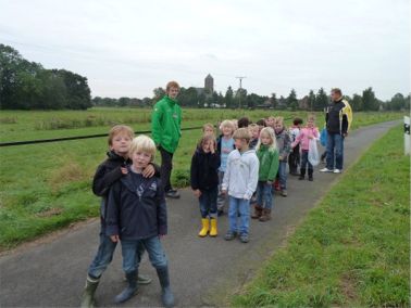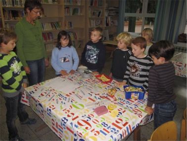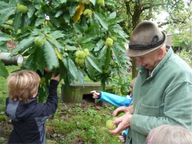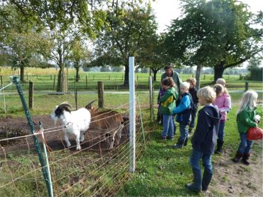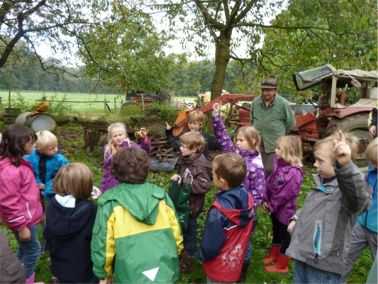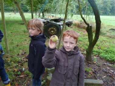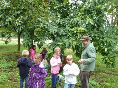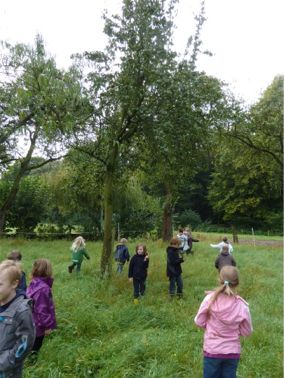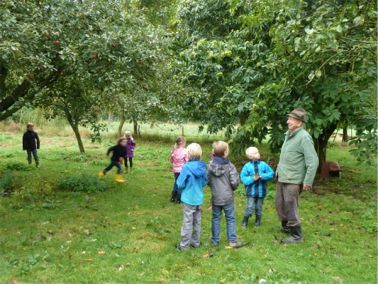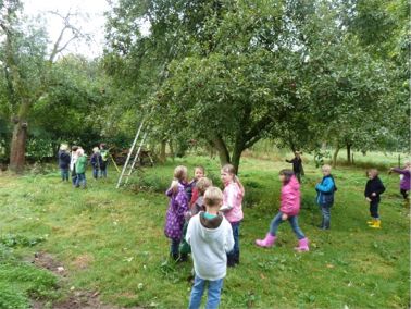 Projekt “Apfel” in der Klasse 1/2 a Im Laufe der Woche besuchte die Klasse die Streuobstwiese der Fam. Hahlen. Hier entdeckten die Kinder die Unterschiede verschiedenster Bäume samt ihrer Früchte. Ein Junge fand den dicksten Apfel. Sogar ein Pfirsich wurde noch gefunden. Die Pflaumen- und Birnbäume waren leider schon geleert. Dafür konnten die Kinder noch viele Kastanien und Nüsse sammeln. Auch die Gänse, Ziegen und Pferde fanden großes Interesse. Vor dem Haus wuchs ein äußerst merkwürdiger Kürbis. Mit vollen Taschen ging es zurück zur Schule. Danke Fam. Hahlen für Ihre Gastfreundschaft! |