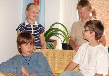 Der Vater hatte Pfingsten frei. Onkel Gerhart kam zu Besuch. Die ganze Familie war zusammen. Ben sprang aus dem Bett und lief in den Garten denn Anna kam zu Besuch. Anna brachte einen Blumenstrauß für Bens Mutter mit. Sie beide gingen in die Küche und suchten eine Vase aus. Als sie eine Vase ausgesucht hatte ging sie nach oben. Anna klopfte an der Tür und Bens Herz schlug wie verrückt. Ben machte die Tür auf und Anna stürzte auf die Meersau Trudi. Sie dachte: „Ist die aber süß!“ Anna schaute sich in Bens Zimmer um. ,, Möchtest du wieder nach Polen?“, fragte er. ,,Ich weiß nicht!“, antwortet Anna. Nach einer Weile gingen sie in den Garten. Während des Essens machte Onkel Gerhart einen seiner Späße. Dann fuhren sie mit dem Auto weg.