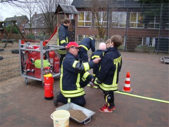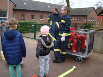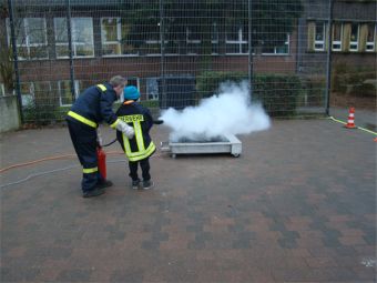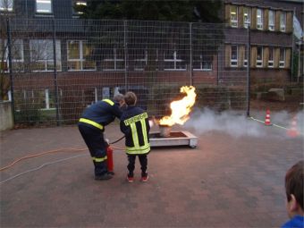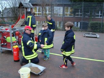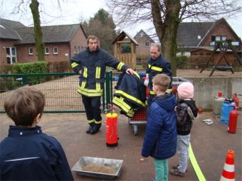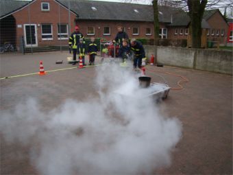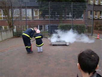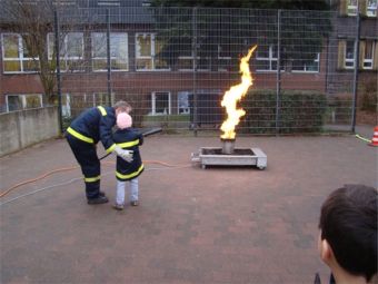 An dieser Station ging es um das Löschen von Feuer. Die Kinder sollten erleben, wie sie selbst ein Feuer löschen können. Dazu hatten die Mitarbeiter der Freiwilligen Feuerwehr Alpen, Löschgruppe Veen, eindrucksvolles Gerät besorgt. Ein Gasbrenner konnte binnen Sekunden eine hohe Flamme erzeugen. Gelöscht wurde mit Druckluft und Wasser aus einem modernen Löschgerät, das alle Kinder bedienen konnten. Es standen auch Sand, Wasser und Löschdecken zur Verfügung. Natürlich gehörte auch die entsprechende Schutzkleidung dazu. Viele Kinder verfügten schon über Grundwissen im Umgang mit Feuer und kannten auch schon die Bedingungen, damit ein Feuer brennen kann. |