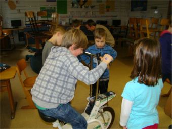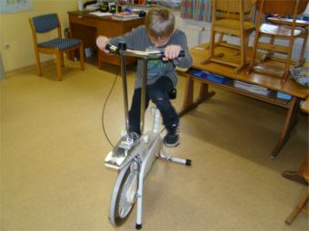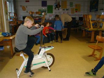 An dieser Station ging es um die Wirkung von körperlicher Bewegung morgens vor der Schule. Lernen ist dann besonders erfolgreich, wenn der Puls sich vorher schon einmal ordentlich nach oben bewegt hat. Unser Gehirn braucht Sauerstoff und Energie – körperliche Bewegung lässt mehr Blut mit Sauerstoff und Energie ins Gehirn kommen und regt die geistige Aktivität an – so ist die Theorie. Dieter Schneider ließ die Kinder die Pulsfrequenz messen, verordnete dann Bewegung auf den Treppenstufen, durch Kniebeugen oder auf dem Ergometer. Danach zeigte das Pulsmessgerät höhere Werte an. Die Kinder strengten sich gerne an – das Ergometer hatte an diesem Vormittag keine Pause. Wünschenswert wäre, dass möglichst viele Kinder zur Schule laufen oder mit dem Fahrrad fahren. |