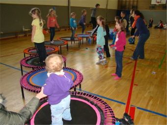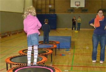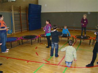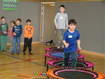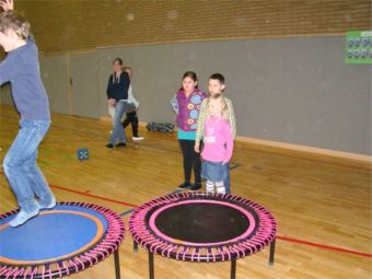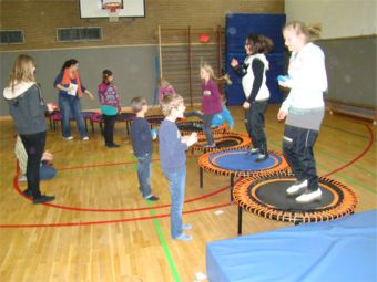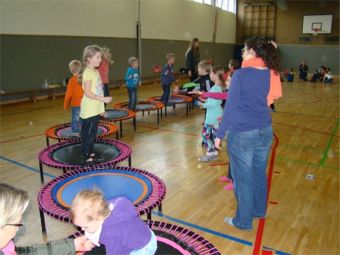 An dieser Station ging es um vielfältige Übungen auf dem Trampolin. Das Minitrampolin gehört seit einem halben Jahr fest in den Lehrplan unserer Schule. Die Kinder aller Klassen haben schon einige Trainingsstunden absolviert und kennen die Regeln im Umgang mit dem Sportgerät. Es wird in der Turnhalle im Sportunterricht eingesetzt, dient aber auch für den Einsatz in Bewegungspausen während des Unterrichts in der Klasse. Bekannte Übungen wurden an dieser Station wiederholt aber auch in Partnerarbeit Karteikarten mit Übungsvorschlägen eingesetzt. Alle Kinder lieben die Bewegung an den Minitrampolinen. |