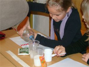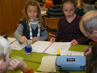 Im Forscherbuch werden alle Versuche genau protokolliert. Die Kinder schreiben auf, was sie beobachtet haben, formulieren ihre Erklärungen und zeichnen den Versuchsaufbau. Der Tag war spannend wegen der vielen Experimente und kurzweilig durch den Wechsel von Raum zu Raum. Es war aber doch ganz schön anstrengend und alle hatten viel zu schreiben und zu zeichnen. Für die am besten gestalteten Forscherbücher haben die Kinder iam 31.3.09 Preise bekommen, und zwar tolle Experimentierbücher und Knobelspiele. Hier ist eine Zusammenstellung der 6 besten Experimentierbücher zu sehen. Die Grundlage für unsere Forscherbücher sind die Vorlagen aus der Handreichung für Lehrer von der Uni Dortmund „Was passiert wenn...,?“ Wir haben alle Vorlagen neu geschrieben, z.T. in starker Anlehnung an die Handreichung, z.T. mit eigenen Ideen (Superabsorber und Tintenkiller). Der Superabsorber stammt aus der Experimentierbox „Kunos tolle Kunststoffkiste“ von plasticseurope. An dieser Stelle danke ich allen Eltern für ihre engagierte Mithilfe. Ohne Sie hätten wir den Tag so nicht durchführen können. |